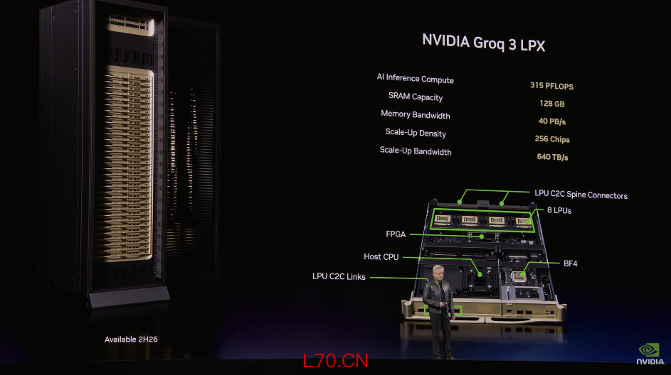 Groq 3 LPX机架搭载256个LPU处理器,提供128GB片上SRAM和640TB/s扩展带宽。LPX与Vera Rubin平台结合后,推理吞吐量/功耗比将能提升35倍。黄仁勋介绍称,LPU芯片将由三星代工,预计机架将于今年下半年开始出货。