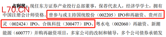 既然说到了信息披露质量,力场君还关注到乔路铭IPO的保荐代表人之一,也挺有故事的。根据《发行保荐书》公布的信息,占利民曾参与或主持过的IPO项目并不多,包括了国统股份(002205.SZ)、贵州百灵(002424.SZ)、合纵科技(300477.SZ),这三家公司在上市后,在信息披露方面,都出了些问题。